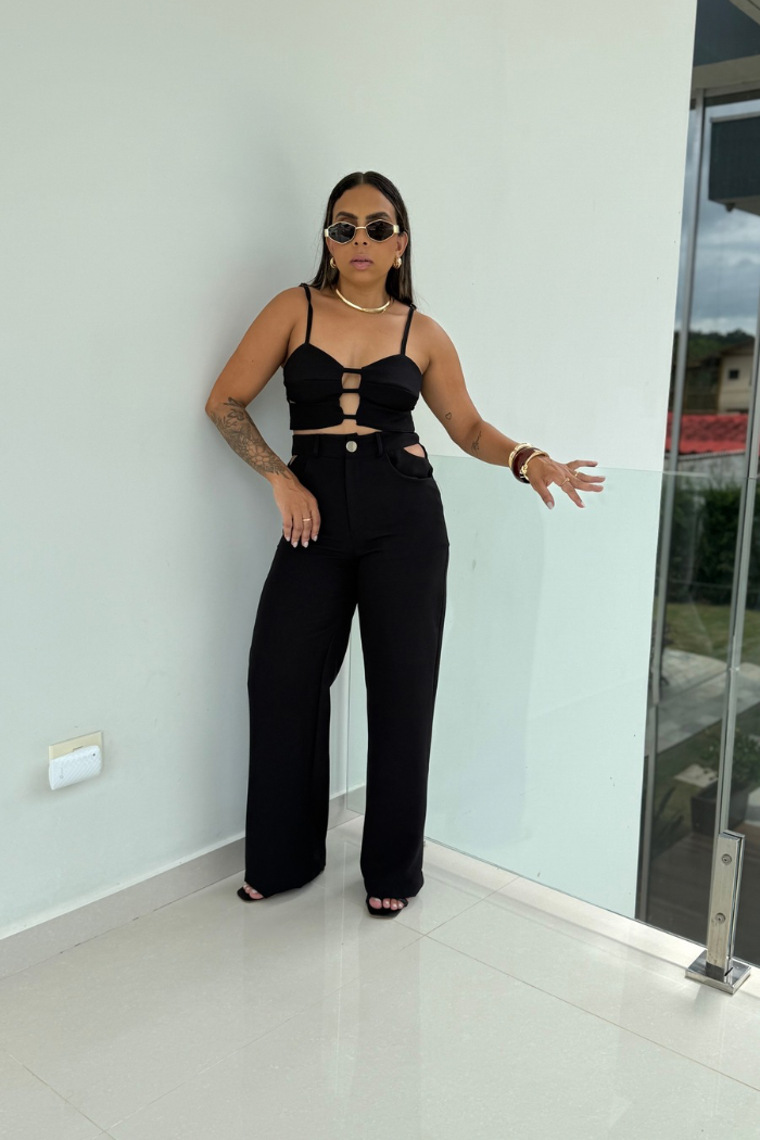 Use a pantalona com croppeds, regatas de alça fina ou camisas ajustadas para destacar o detalhe do cós. Para um look sofisticado, aposte em sandálias de salto, mules ou scarpins. Em propostas mais modernas, combine com blazers estruturados ou conjuntos coordenados.