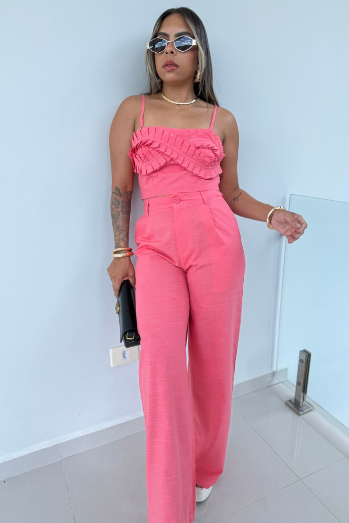 Combine com uma calça de alfaiataria para um look chic completo — perfeito para eventos, jantares ou ambientes mais formais. Para um visual fashionista, aposte em uma saia midi ou shorts de cintura alta. Finalize com sandália de tiras finas ou salto bloco e acessórios minimalistas para realçar o babado do busto.