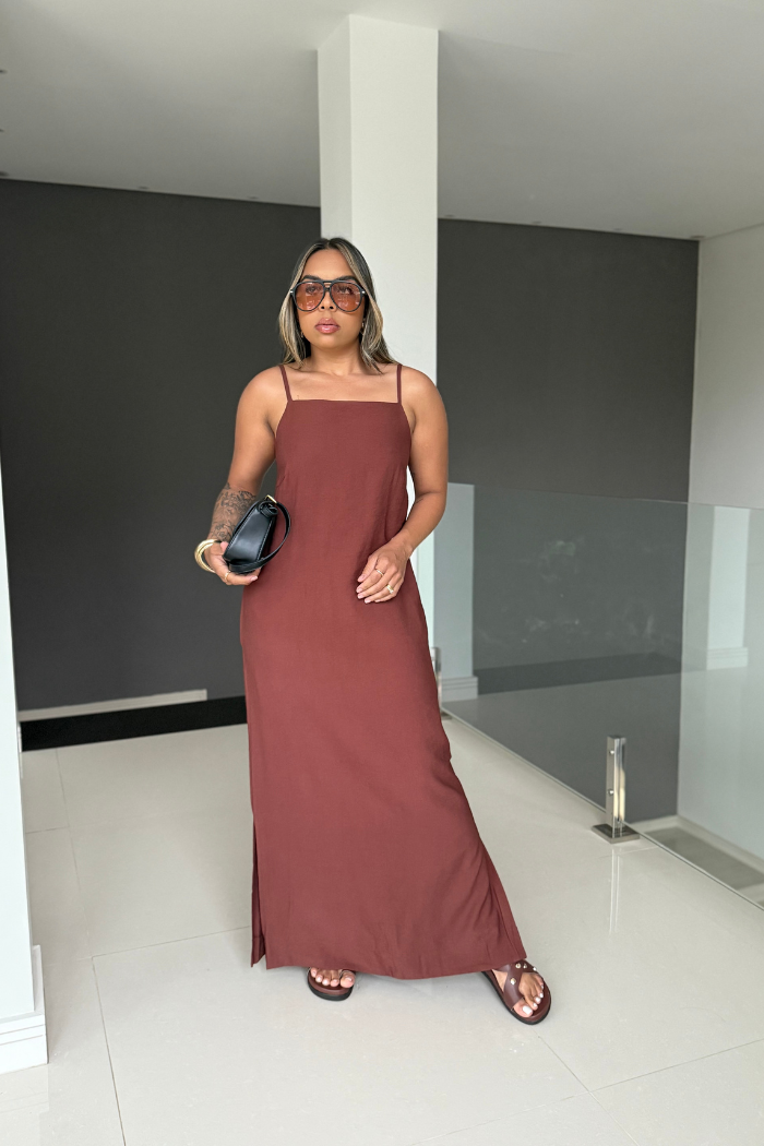 Elegância e conforto em uma única peça. Este vestido longo é a escolha perfeita para compor looks modernos e versáteis, sem abrir mão do estilo. Com fendas laterais que garantem leveza e movimento, o modelo conta com elástico nas costas, proporcionando um ajuste perfeito ao corpo e mais liberdade ao vestir.